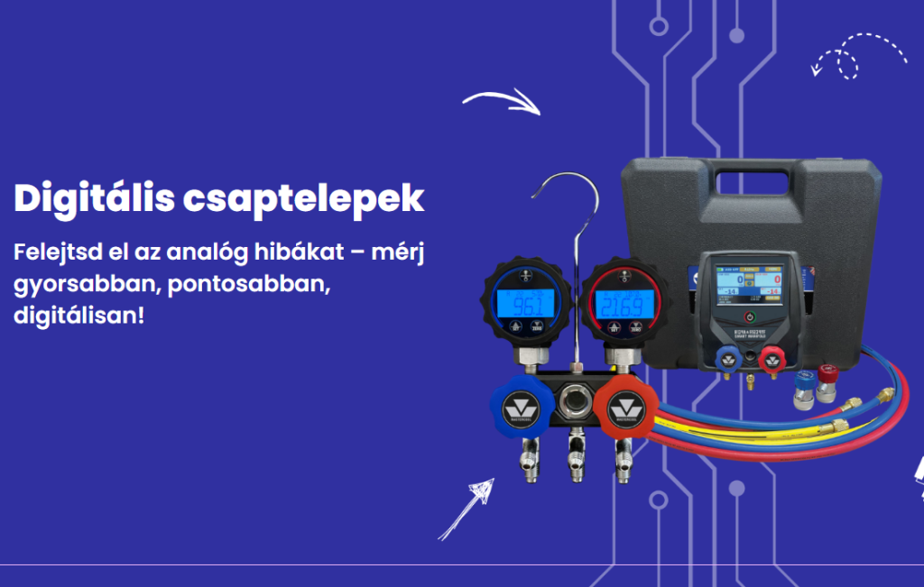 Az oldal a digitális szervizcsaptelepeket mutatja be, amelyek pontosabb, gyorsabb és megbízhatóbb munkát tesznek lehetővé autó- és épületklímások számára. Automatikusan számolják a túlhevítést és utóhűtést, csökkentik a hibákat, és több hűtőközeggel is kompatibilisek, így egyetlen eszközzel hatékonyabbá válik a szervizmunka.