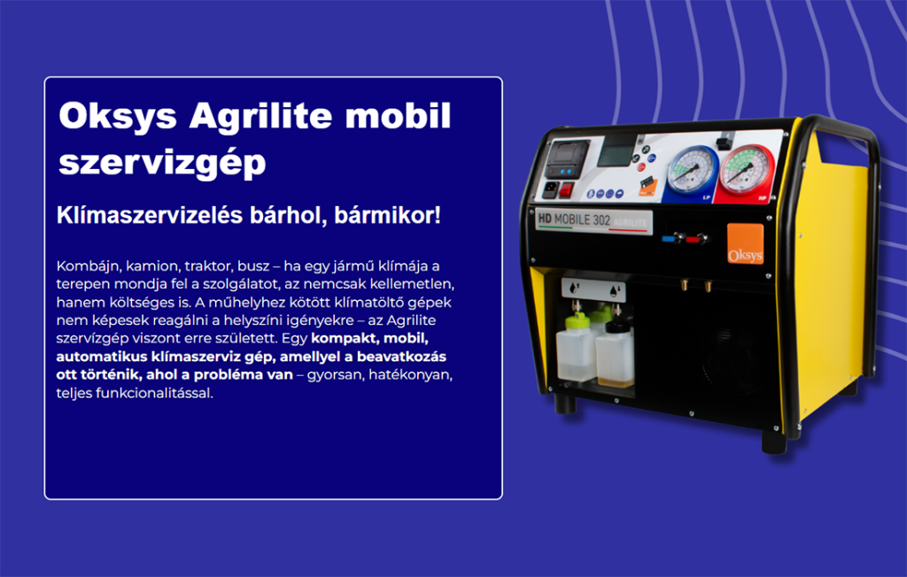 Az oldal az Agrilite szervizgépet mutatja be, amely egy kompakt és hordozható 4‑az‑1, teljesen automata klímaszerviz állomás. A gép vákuumoz, újratölti, visszagyűjti és újrahasznosítja a klímagázt (R1234yf és R134a), az okostelefonos Bluetooth‑kapcsolatnak és a felhasználóbarát irányítópultnak köszönhetően egyszerű a használata. Hosszú, 7,5 m-es tömlőkkel, belső öblítési funkcióval és nitrogén + olajfeltöltési lehetőséggel rendelkezik, így professzionális felhasználóknak – például mezőgazdasági és nehézgépjármű‑szervizeknek – ideális választás.