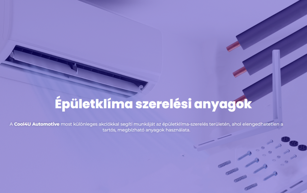A Cool4U Automotive kínálatában épületklíma-szerelési anyagok érhetők el, mint a masszív fali konzolok ajándék csavar- és rezgéscsillapító készlettel, valamint a Condix UV-Pro szigetelt rézcsövek, amelyek háromszoros UV-védelemmel, kiváló páraellenállással és környezetbarát kivitelben készülnek. Vásárláskor ajándék fali konzol jár a rézcső mellé, cégként regisztrálva pedig 10% kedvezmény érhető el.