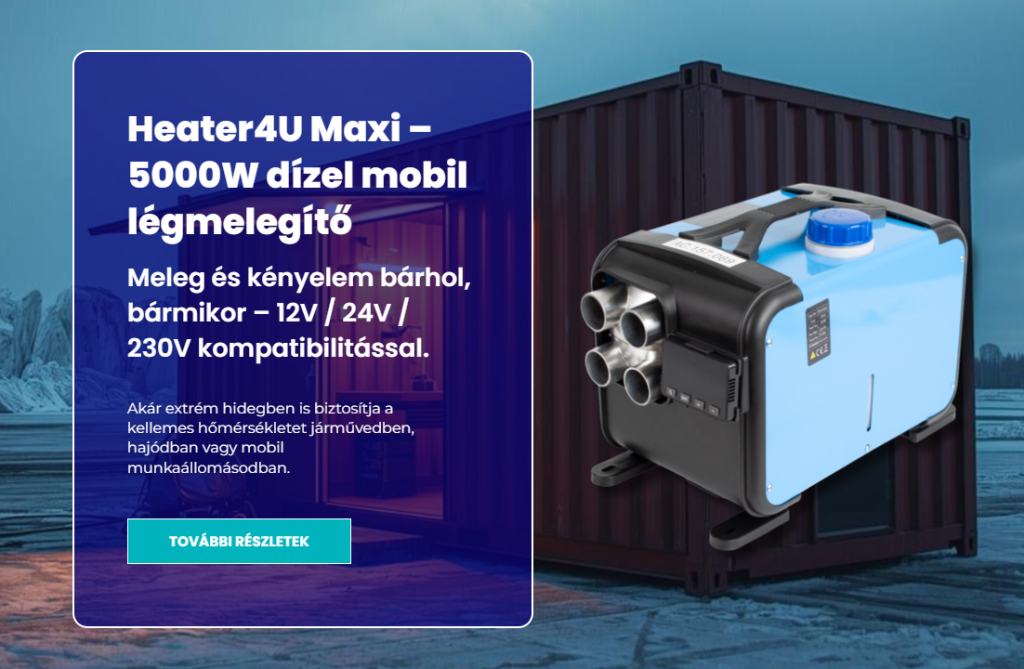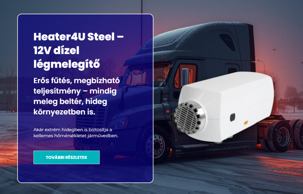 Az oldalon a Heater4U Steel típusú 12 V dízel légmelegítőt mutatják be, amely 2–5 kW teljesítményre képes. A készülék 80–200 m³/óra légáramlást biztosít, és –40 °C-tól +40 °C-ig működik, akár 5000 m magasságig is. Fogyasztása 0,18–0,5 l/óra, így ideális választás olyan autókhoz vagy járművekhez, ahol precíz, kis méretű és megbízható fűtésre van szükség.
